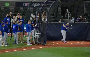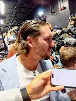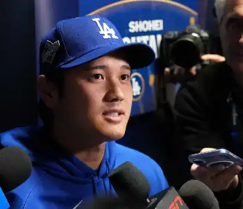メディアの取材に応じるドジャース・佐々木朗希(撮影・杉浦 大介通信員)