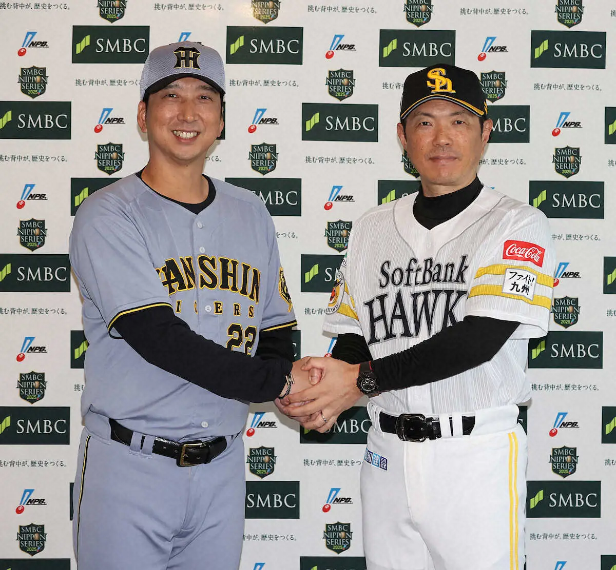 監督会議を終えて握手する阪神の藤川監督(左)とソフトバンクの小久保監督(撮影・岸 良祐)