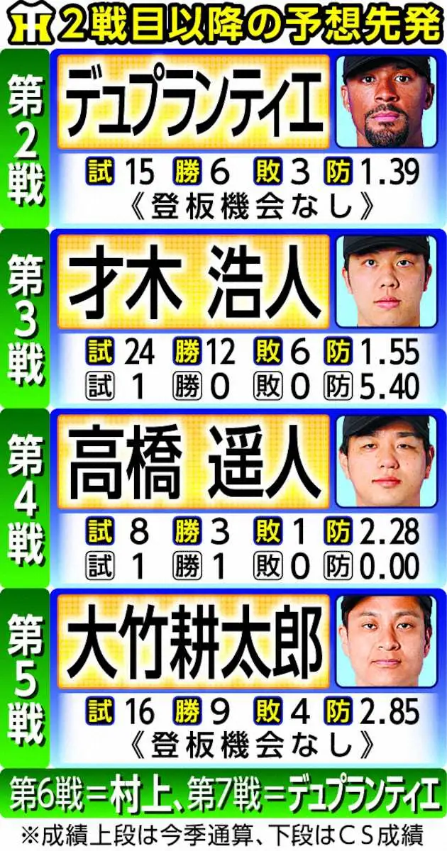 デュプランティエはCSファイナルステージでは登板機会がなく、18日に甲子園でライブBP(実戦形式の打撃練習)に登板。打者17人を無安打に封じて状態の良さを示した。才木は、甲子園で行われる第3戦以降での先発が決定的となった。