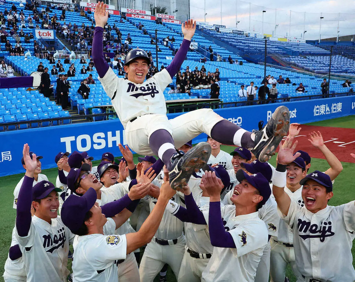 <立大・明大>全勝優勝を決め、戸塚監督(中央)を胴上げする明大ナイン(撮影・藤山 由理) Photo by スポニチ 明大・戸塚監督が10度舞った!29年ぶり2度目の10戦全勝 小島22歳の誓い「… ギャラリーで見る この記事のフォト 2025年10月27日の画像一覧 もっと見る 2025年10月27日の画像をもっと見る