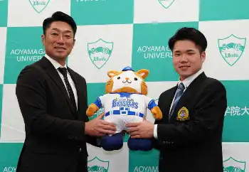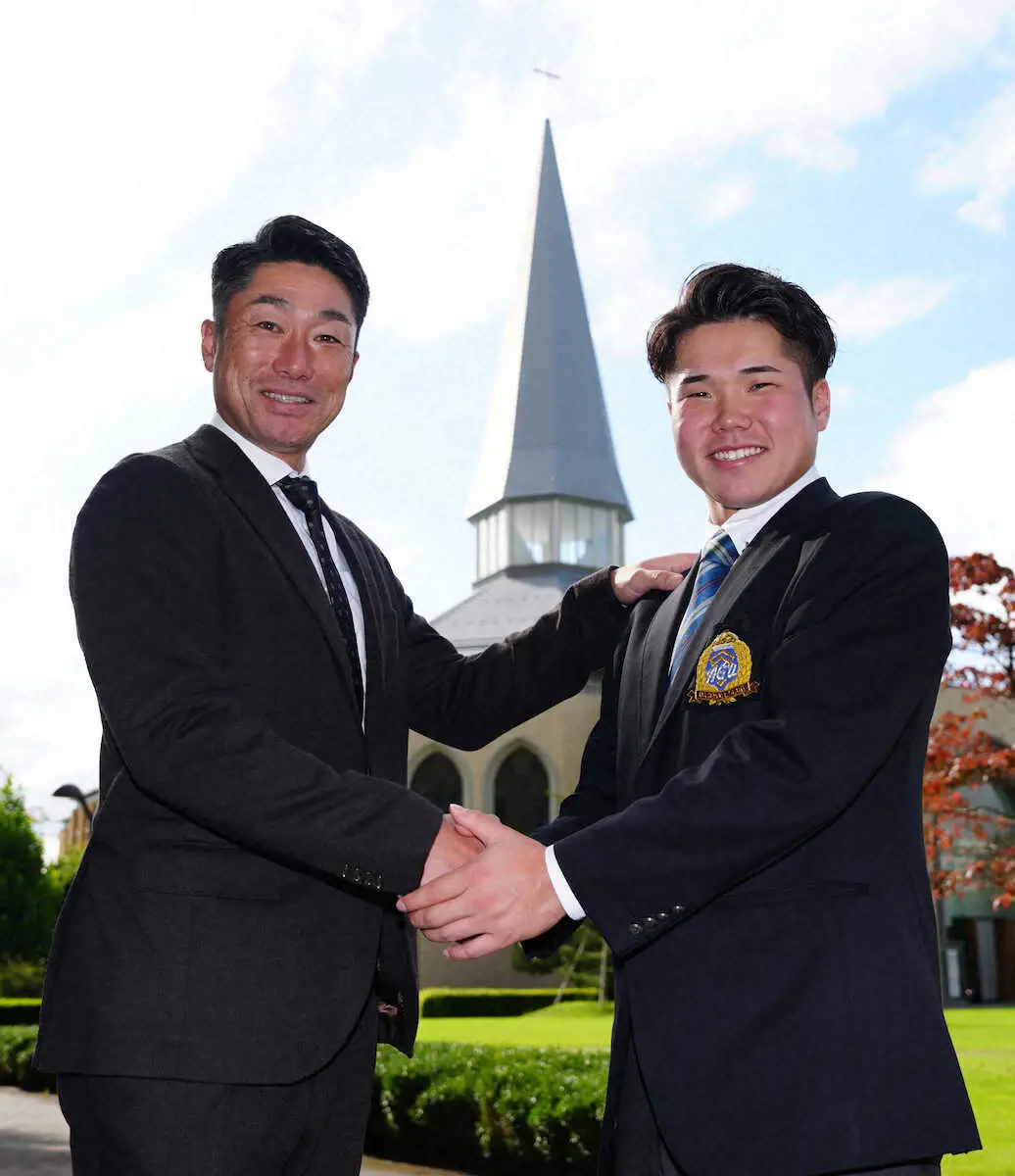 <DeNA指名あいさつ>相川監督(左)から球団マスコットのぬいぐるみを贈られた青学大・小田(撮影・島崎忠彦) Photo by スポニチ DeNAドラフト1位青学大・小田に相川新監督がサプライズあいさつ 小田は「… ギャラリーで見る この記事のフォト 2025年10月27日の画像一覧 もっと見る 2025年10月27日の画像をもっと見る