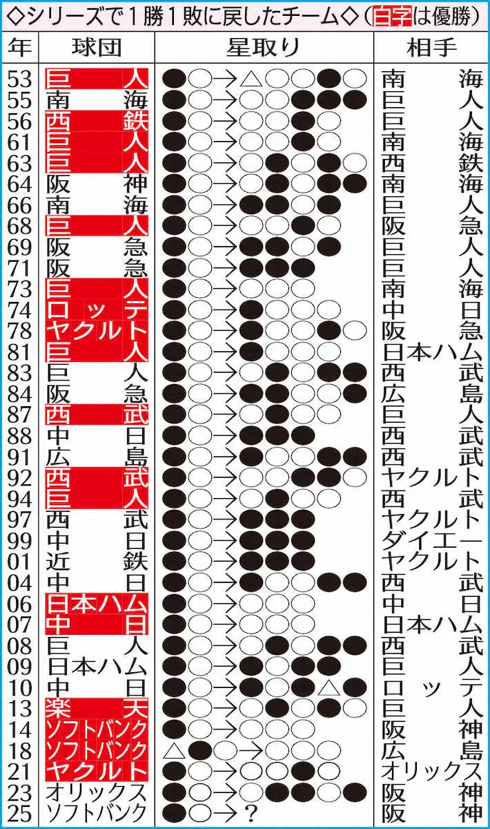 ○…ソフトバンクが1勝1敗のタイに戻した。1勝1敗のシリーズは通算36度目。過去35度のうち、●○スタートのVが18度、○●のVが17度とほとんど互角だ。なお、ソフトバンクの●○スタートは今回で5度目。過去4度のうち南海時代の55、66年はV逸も、ソフトバンクとなった14、18年の直近2度は日本一に輝いている。