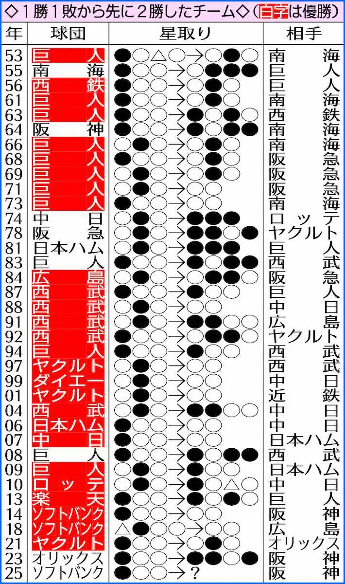 ○…ソフトバンクが連勝で対戦成績を2勝1敗とした。1勝1敗(引き分けも含む)から先に2勝したチームは過去35度のうち27度優勝しており、V確率は77%。直近の20チームに限ると、18チームが優勝しており、V確率は90%と高い。