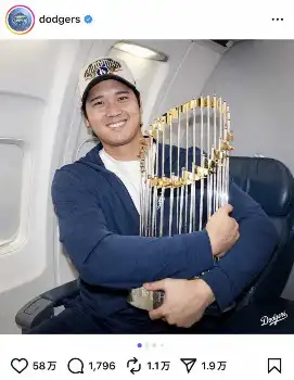 ドジャースは2年連続9度目のワールドシリーズ(WS)制覇から一夜明けた2日(日本時間3日)、トロントからロサンゼルスに空路戻った。球団の公式SNSは大谷翔平投手(31)や山本由伸投手(27)、佐々木朗希投手(24)らが機内で優勝トロフィーを抱いて喜ぶ写真や映像を投稿。3日(同4日午前4時開始)はロサンゼルス市内でパレードを開催し、本拠地ドジャースタジアムで優勝報告会を行う。