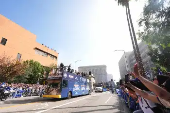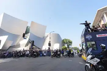 ドジャースV2パレード 選手乗ったバスの両脇に数十台のバイク並走 数多くの警察官が警備で厳戒態勢