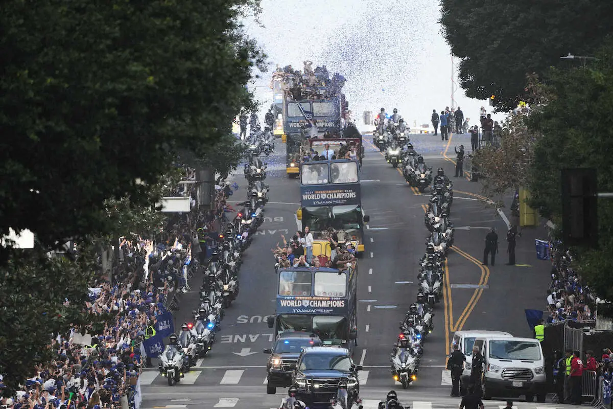 ロサンゼルスが熱狂に包まれたV2パレード。チームは2階建てバス8台に分かれて乗車した。大谷翔平投手は山本由伸投手らと同じバスに乗り込み、横には真美子夫人の姿もあった。