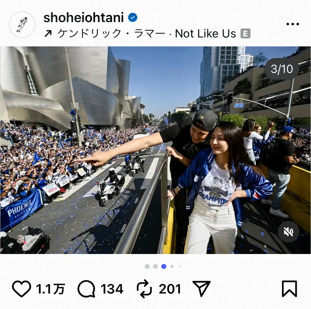 大谷は「Thank you LA」と記し、パレードでバス上から観衆に手を振る写真やフリーマン、山本由伸との3ショットを公開。その他、真美子夫人とぴったり寄り添い、観衆の方に指を指す写真や両膝に手を付き、真顔でお行儀良く座るお茶目な1枚も投稿した。