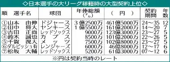 ≪契約額日本選手2番目、全体では3番目≫大リーグでの日本選手の契約最高額は23年オフのドジャース・大谷が結んだ、10年総額7億ドル(契約時=約1015億円)。2位が同年オフのド軍・山本の12年総額3億2500万ドル(同=約461億5000万円)で、日本からの大リーグ移籍時では山本が最高額だ。今井が予想通りの金額となれば、13年オフ、ヤンキース・田中将(現巨人)の7年1億5500万ドル(同=約161億2000万円)を上回り渡米時では日本選手2番目、全体でも3番目となる。