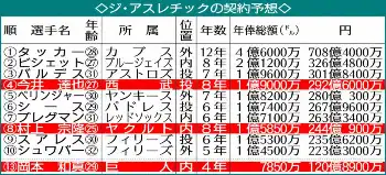 今井について広池浩司球団本部長は「代理人さんと話はしている。今度本人と話して、そこで結論は出ます。(球団の)方向性はある程度決まっている」と話したが、球団はポスティングを容認する方向で最終調整に入っている。記事では今井の移籍に伴う西武への譲渡金は約3000万ドル(約46億2000万円)。巨額マネーが動くその去就が、さらなる注目を集める。(鈴木 勝巳)