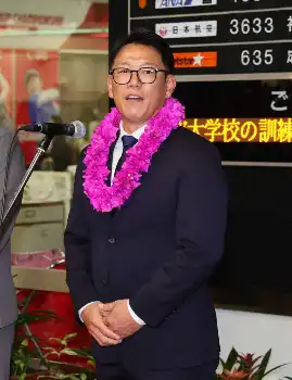 「ラグザス 侍ジャパンシリーズ2025 日本VS韓国(15、16日=東京ドーム)」に出場する侍ジャパンは、6日から宮崎で強化合宿をスタートさせる。この日、井端監督は宮崎入り。宮崎空港での歓迎セレモニーを終え「縁起のいい地。連覇に向けて頑張っていきたい」と宣言した。