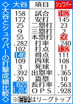 主に1番打者だった今季、自身に言い聞かせるように繰り返してきた言葉だ。21年の96四球を大きく上回る自己最多の109四球を選んだ。球団歴代2位の146得点、出塁率と長打率を足したOPSの1.014はいずれもリーグ断トツ。特にOPSは近年の大リーグでは打者を評価する指標として最も重視されており、リーグ2位のシュワバーの.928には大差をつけた。安打数や打率、長打の数や盗塁でも大谷が大きく上回った。デーブ・ロバーツ監督は「昨年は無理に安打を狙う場面も見受けられたが、今季は選球眼がとてもいい。打者として2段階は成長したと思う」と変化を指摘し評価していた。