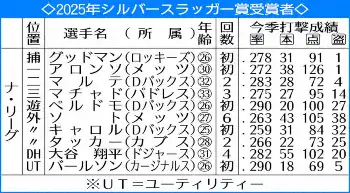 ▽シルバースラッガー賞 80年に創設され、打撃のベストナインに相当する。監督やコーチの投票で、両リーグの各ポジションから選ばれる。自チームの選手には投票できない。歴代最多受賞はバリー・ボンズの12度で、DH部門ではデービッド・オルティスの7度。日本選手では大谷の他にイチローがマリナーズ時代に外野手として3度受賞している。