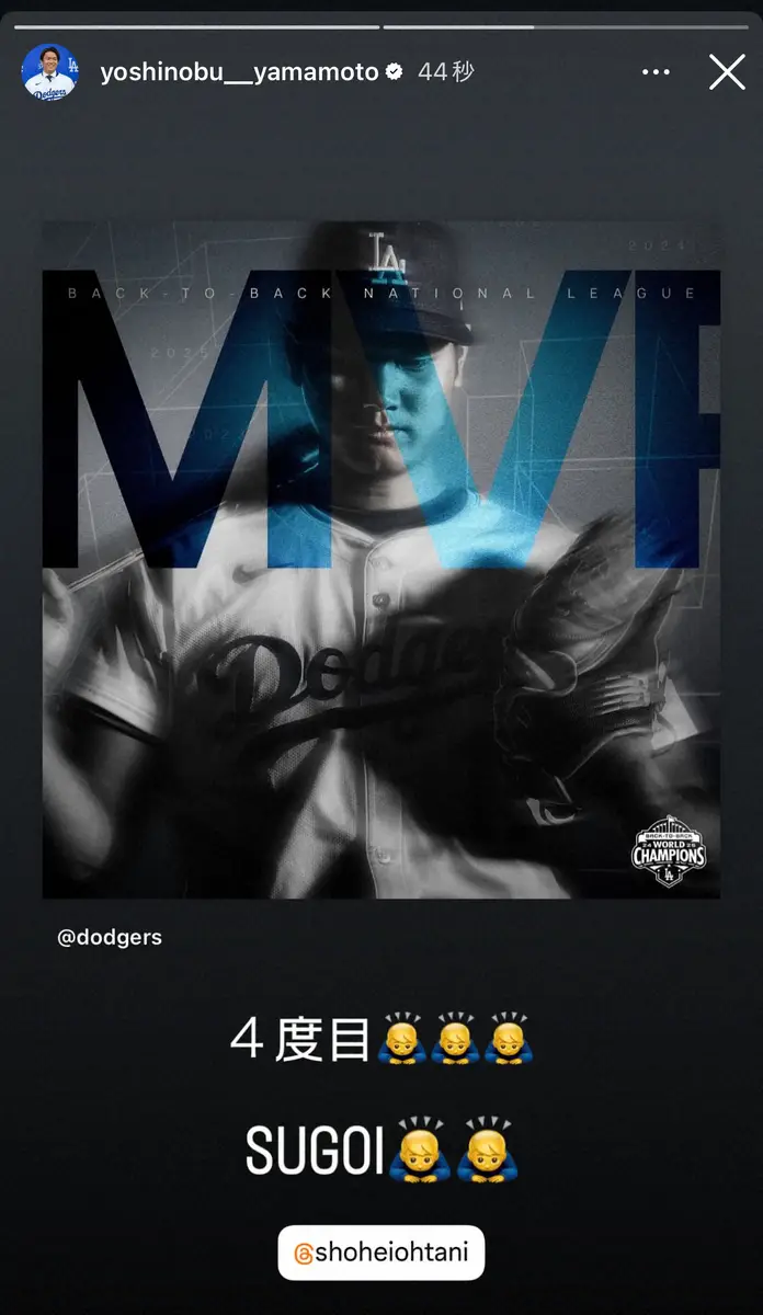 ドジャースの優勝パレードに参加した大谷翔平(左)と山本由伸。後方には二人の姿をスマホで撮影する大谷の妻・真美子さんの姿も(AP) Photo by AP 山本由伸 MVP受賞の大谷翔平を祝福「4度目 SUGOI」 自身もMLBアワード… ギャラリーで見る この記事のフォト 2025年11月14日の画像一覧 もっと見る 2025年11月14日の画像をもっと見る