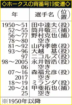 そして、新しい背番号「19」でさらなる高みを目指す。同番号は故・野村克也氏、巨人にFA移籍した甲斐拓也がつけて捕手のイメージが強いが、過去には山内孝徳氏、永井智浩氏(編成育成本部長兼スカウト部長)、森福允彦氏ら個性あふれる投手たちが背負ってきた。受け継ぐ大津の来季目標は自身初の2桁勝利。今オフも同じ背番号19の師匠・山岡との自主トレで鍛えて準備する。