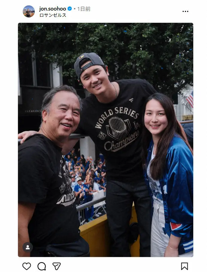 スーフー氏は「MVPおめでとう!ショウヘイ」とつづり、大谷夫妻との3ショットを投稿。ドジャースはワールドシリーズを制し、3日(日本時間4日)にロサンゼルスで優勝パレードを行っており、その時のオフショットとみられる。
