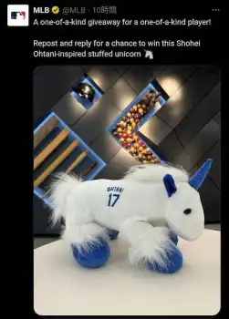 「唯一無二の選手のための唯一無二のプレゼント!」とし、賞品は大谷の名前と背番号が入ったユニコーンのぬいぐるみ。伝説上の生き物「ユニコーン」は二刀流・大谷の凄さを形容する言葉として米国でも定着している。リポストや返信の中から当選となる見込みだ。