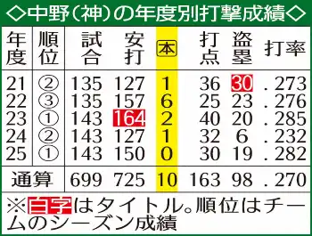 阪神・中野拓夢 「ホームランを1本打つより打率を上げた方がいい」来季も0本塁打でセ・リーグ連覇を狙う