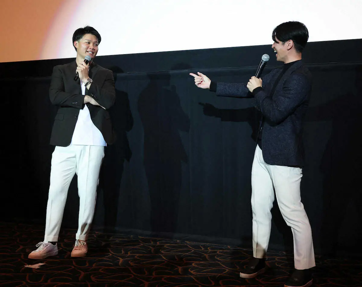 舞台あいさつで軽妙なトークを繰り広げる森下(左)と近本(撮影・大森 寛明)