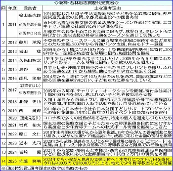 ▽若林忠志賞 阪神が社会貢献・慈善活動やファンサービスに継続的に取り組み、優れた見識を持つ自チームの選手を表彰する制度。2011年7月創設。球団創設時から活躍し、グラウンド外の活動でプロ野球選手の模範となった元投手・監督、若林忠志氏(1908―65年)の功績をたたえ命名した。毎年オフ、選手1人を表彰、記念の盾と賞金100万円、活動資金100万円を贈る。
