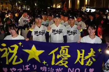 明大が優勝パレード 小島、大川、毛利のドラフト・トリオが沿道からの声援に応える