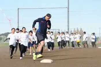 イチローさんは子どもたちに野球を指導。最初にウオーミングアップとして先頭に立ってランニングを行ったが、途中から「ペース上げるよ!」と軽やかな足取りを披露した。