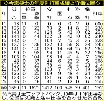 今宮は今季までプロ16年間で遊撃手としてパ・リーグ記録の1621試合に出場している。遊撃以外の守備は入団2年目で1軍デビューを果たした2011年に一塁で11試合に途中出場しただけ。広い守備範囲、強肩を生かした球界最高峰の遊撃の守備力で君臨してきた。
