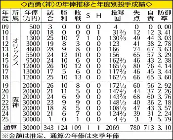 「伏見稲荷」で厄払いだ。阪神・西勇が、兵庫県西宮市内の球団事務所で契約更改交渉に臨み、現状維持の年俸3億円でサインした(金額は推定)。来季は4年契約の最終年。日本ハムからトレードで移籍した、オリックス時代の同僚・伏見との同学年バッテリーで、投手陣の中心に舞い戻る。