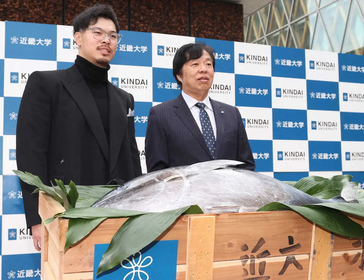 今季のセ・リーグ最優秀選手賞(MVP)に輝いた阪神・佐藤輝明内野手(26)が2日、東大阪市の母校・近大でMVP受賞記念セレモニーに出席した。同大学OBの受賞は史上初の快挙であることを受け、松村到学長(67)から、体長1・2メートル、重さ32・2キロ(25万円相当)の「近大マグロ」が贈られた。