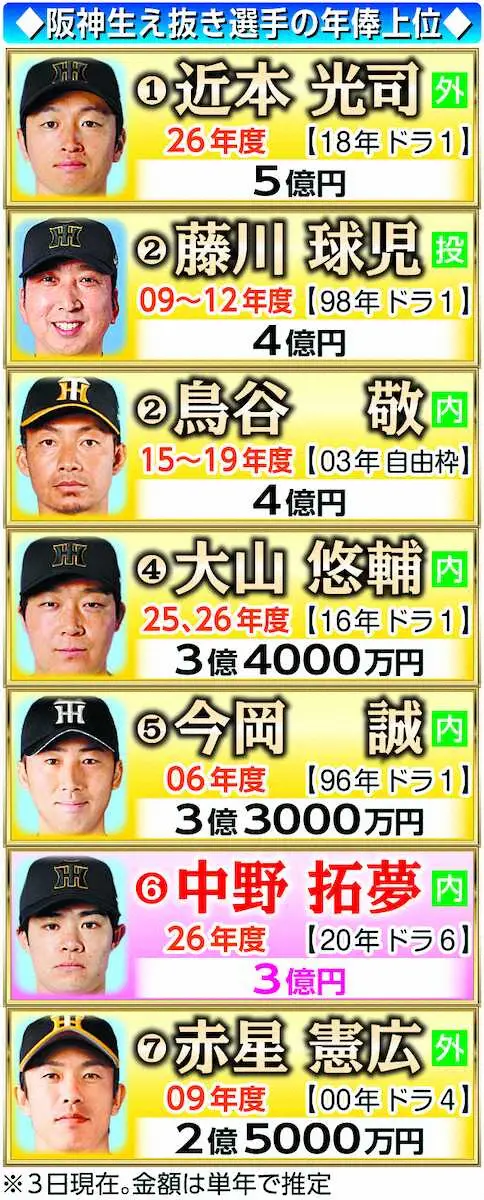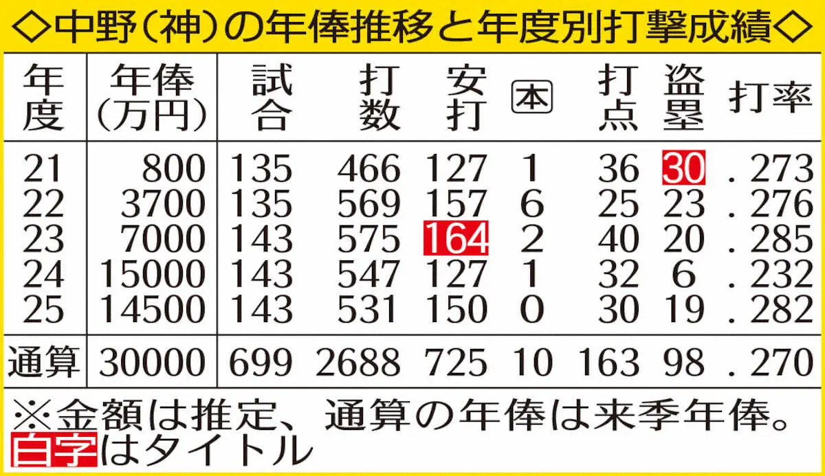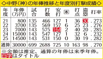契約更改交渉を終えた中野は来季の目標に“全試合”出場を掲げる(撮影・大森 寛明) Photo by スポニチ 阪神・中野拓夢「高く評価してもらえた」入団6年目史上最速タイの年俸3億… ギャラリーで見る この記事のフォト 2025年12月04日の画像一覧 もっと見る 2025年12月04日の画像をもっと見る