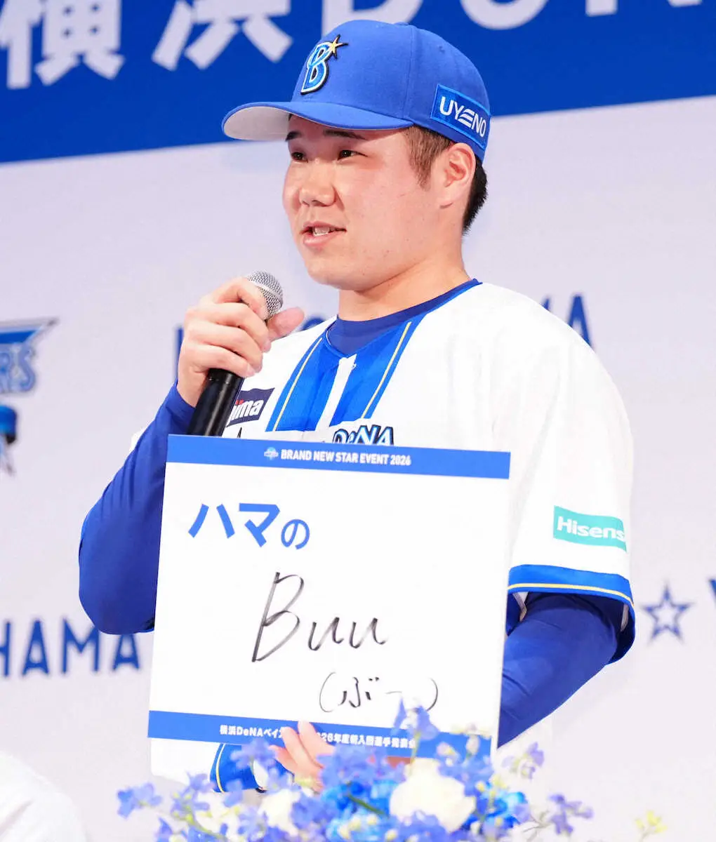 ドラフト1位指名の小田康一郎内野手(青学大)は大学時代からの愛称「ハマのBuu(ブー)」をアピール。ファンから大歓声を浴びていた。