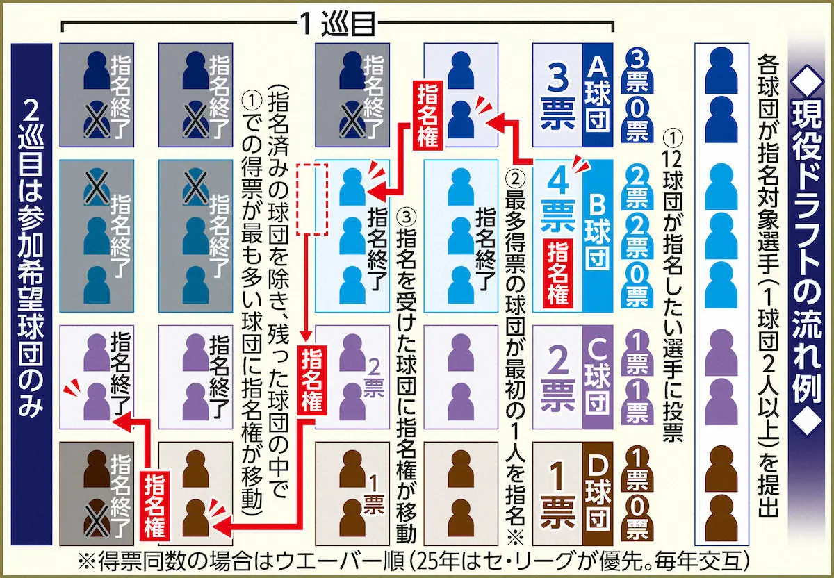 今年で4回目となるプロ野球の「現役ドラフト」が9日に開催され、12球団が各1人ずつ選手を指名した。2巡目は行われなかった。