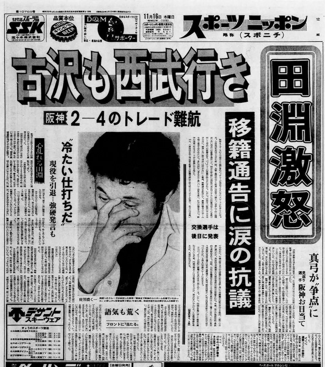 78年11月15日、深夜の会談に疲れ切った様子の田淵幸一 Photo by スポニチ 【阪神90周年企画】田淵幸一が忘れたことがない長い長い夜 1978年衝撃の… ギャラリーで見る この記事のフォト 2025年12月09日の画像一覧 もっと見る 2025年12月09日の画像をもっと見る