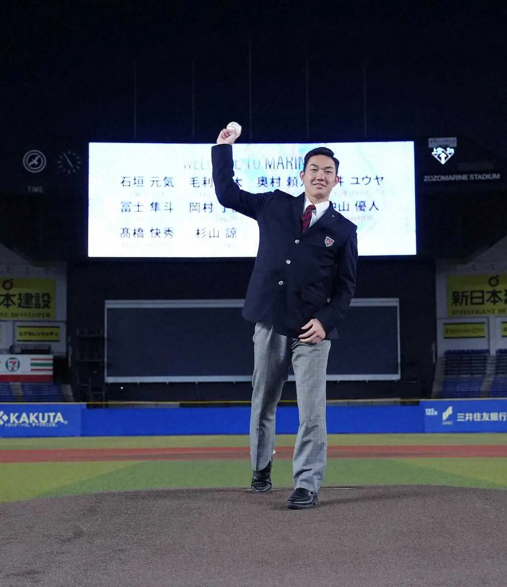 本拠地ZOZOマリンスタジアムを見学したロッテのルーキーたち。左から杉山諒、中山優人、岡村了樹、桜井ユウヤ、毛利海大、石垣元気、奥村頼人、冨士隼斗、田中大聖、髙橋快秀(撮影・長久保 豊) Photo by スポニチ ロッテ新入団選手がZOZOマリン見学 ドラ1石垣元気わくわく「早くこの球場… ギャラリーで見る この記事のフォト 2025年12月10日の画像一覧 もっと見る 2025年12月10日の画像をもっと見る