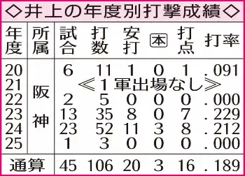 ◇井上 広大(いのうえ・こうた)2001年(平13)8月12生まれ、大阪府出身の24歳。履正社では3年の春夏連続で甲子園出場。夏は大会3本塁打で初優勝に貢献。19年ドラフト2位で阪神入団。24年にウエスタン・リーグで打率.308を記録し、首位打者を獲得。今季の1軍出場は「6番・左翼」で先発出場した4月1日DeNA戦の1試合のみ。1メートル89、100キロ。右投げ右打ち。