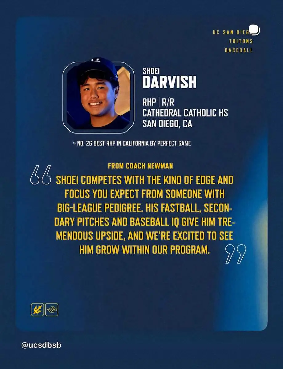 ダルビッシュの息子がカリフォルニア大サンディエゴ校野球部に加入 「大リーガーの系譜に連なる」と紹介