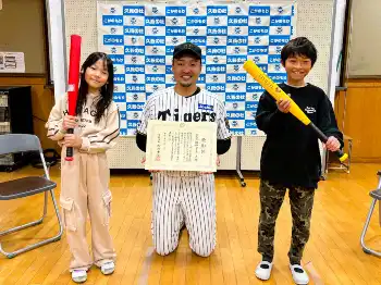 阪神・岩崎が“滋賀っ子”にサプライズの野球教室 恒例ガチンコ対決ではまさかの…