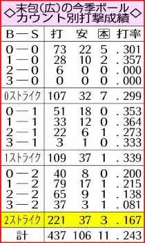 表・末包(広)の今季ボールカウント別打撃成績 Photo by スポニチ 広島・末包昇大 粘りの打撃で天敵撃ちだ 2ストライク後の打率低迷…来季… ギャラリーで見る この記事のフォト 2025年12月13日の画像一覧 もっと見る 2025年12月13日の画像をもっと見る