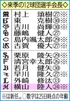 25歳シーズンでの会長就任は01年の黒木知宏、13年の成瀬善久の28歳を下回り、2000年以降では球団最年少。来季12球団の選手会長でも最も若い。ZOZOマリンで自主トレに励んだ横山は「(現会長の中村)奨さんから直々にお話をいただき、いろいろお話して引き受けることにしました」と説明した。