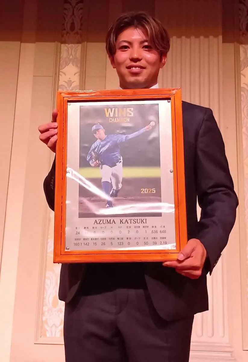 今季2年ぶり2度目の最多勝(14勝8敗)を手にしたDeNA・東克樹投手(30)が27日、名古屋市内で母校「愛工大名電野球部70周年記念パーティー」に出席。同野球部から最多勝のオリジナル記念盾を贈られた。