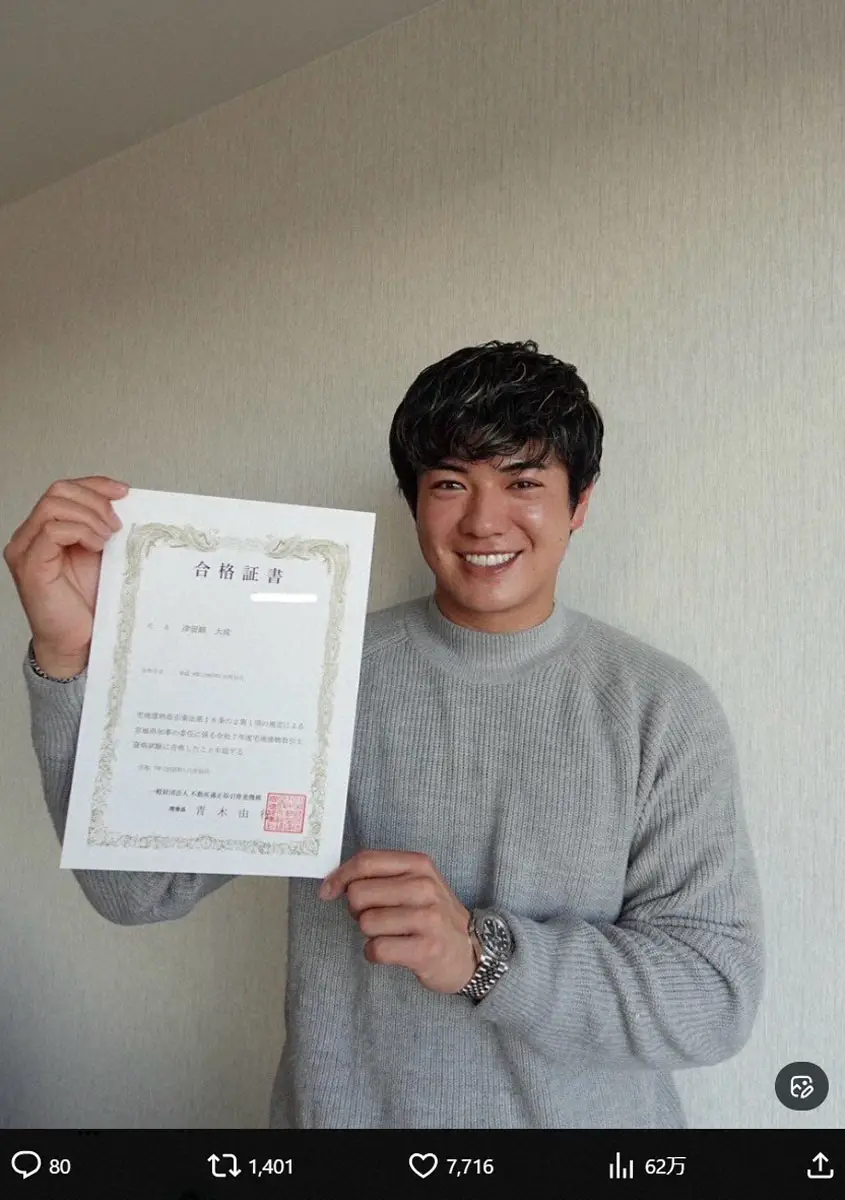 楽天の中継ぎ右腕・津留崎がSNSで「宅地建物取引士(宅建士)」の資格試験に合格したと合格証書を手に報告した。
