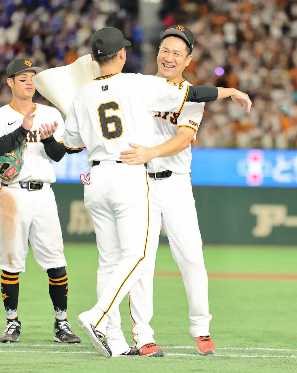 9月30日の中日戦で日米通算200勝を達成し、坂本(左)と抱き合う田中将