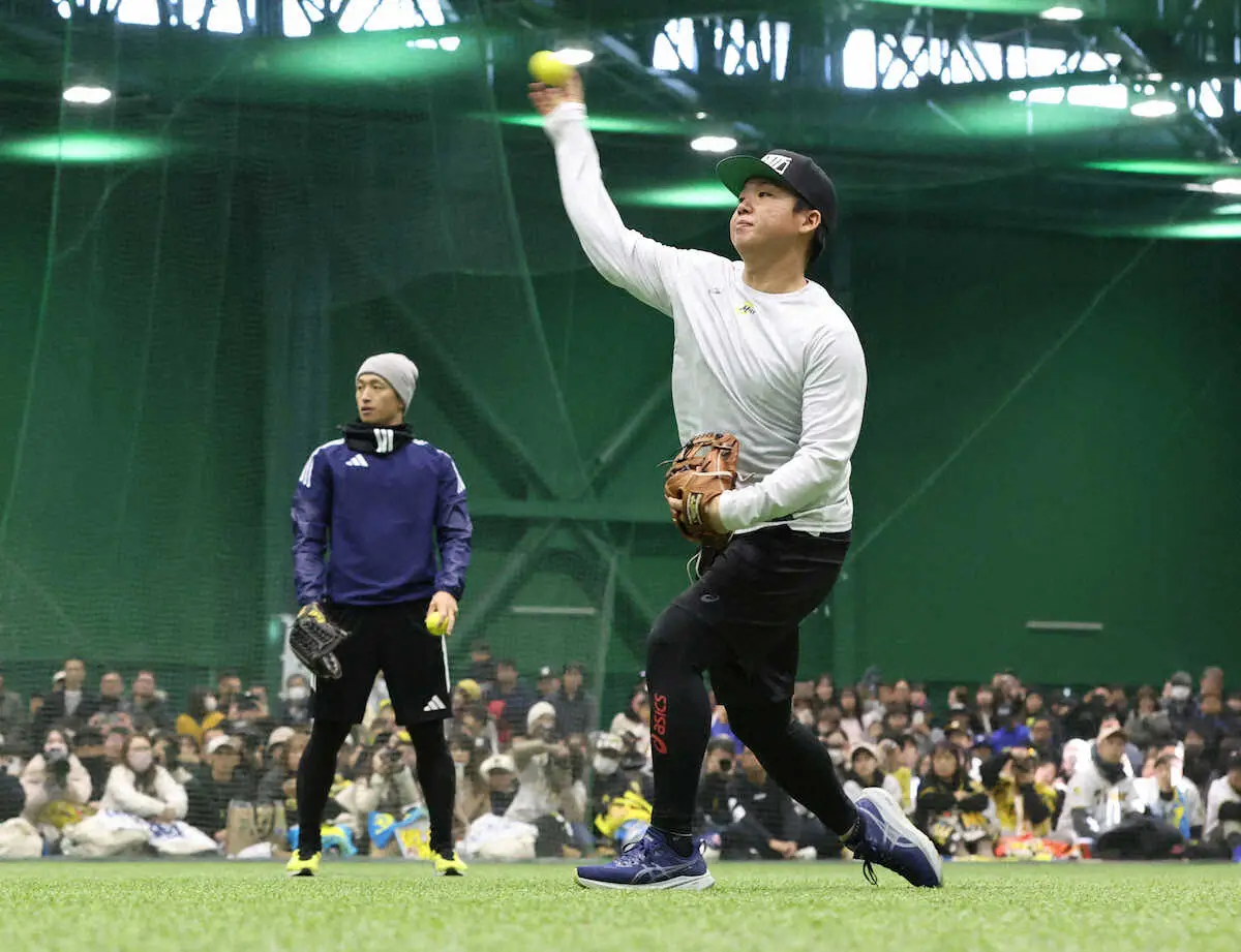 合同自主トレには2日間で計3500人の虎党が集まった。白を基調とした村上タオルも数多く見られたものの、「チカさんと競り合うのは無理」と笑って白旗を揚げた。来年は沢村賞投手として淡路島に帰還し、先輩に負けない声援を浴びる。(松本 航亮)