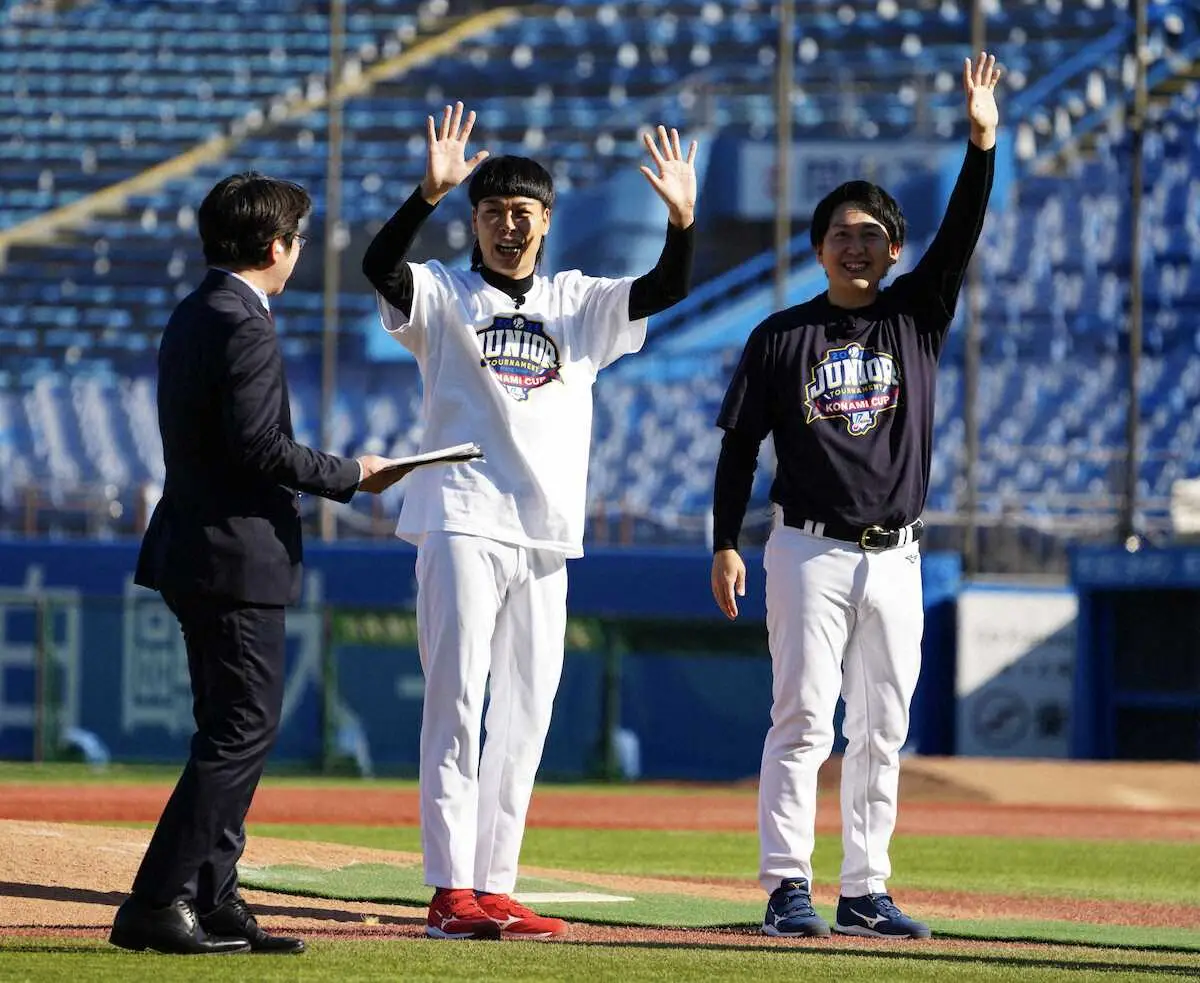 「NPBジュニアトーナメント KONAMI CUP 2025」は29日、神宮球場で準決勝、決勝を迎えた。ソフトバンクJrと阪神Jrの決勝前には、応援隊長を務めたお笑いコンビ「バッテリィズ」が駆けつけ、エールを送った。野球経験者のエースが投手、相方の寺家が捕手役を務め、126キロを計測するストライク投球で球場を沸かせた。