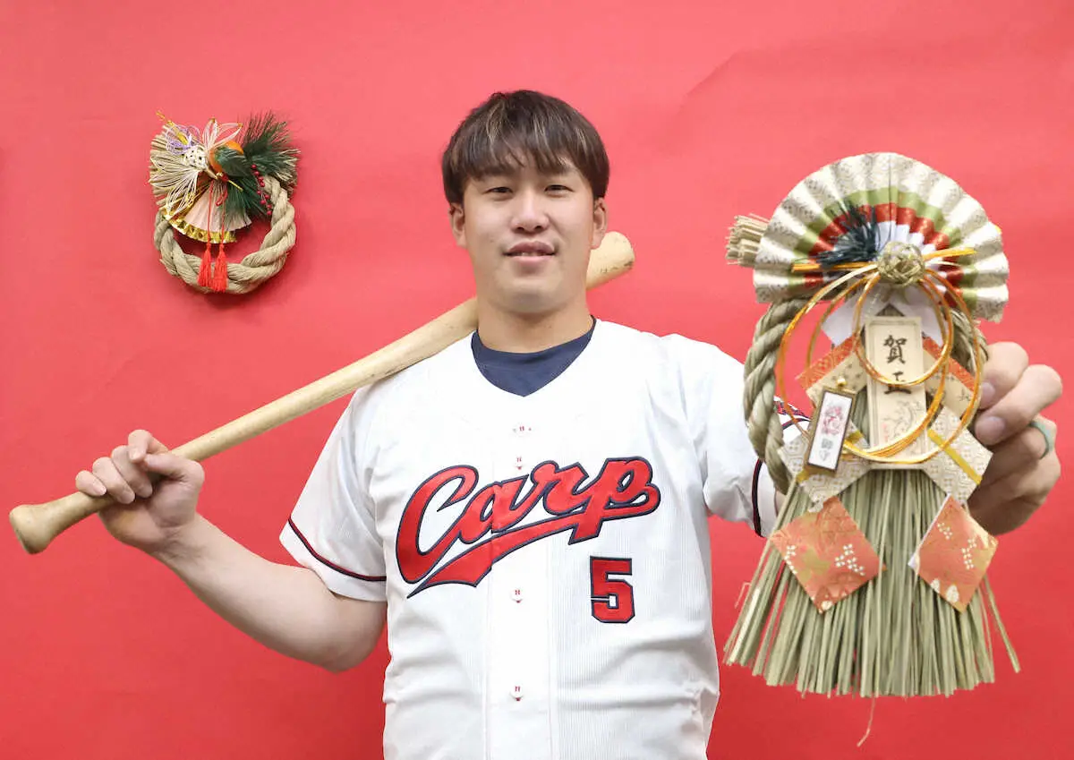 正月飾りを手に今年の意気込みを示した広島・小園(撮影・椎名 航)