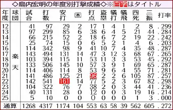 ◇島内 宏明(しまうち・ひろあき)1990年(平2)2月2日生まれ、石川県出身の35歳。星稜(石川)では主将を務め、3年夏に甲子園出場。明大では野村祐輔(現広島コーチ)とともにチームを支え、4年春秋に外野手でベストナイン。11年ドラフト6位で楽天に入団。21年に打点王、22年に最多安打、ベストナイン。球宴出場2度で地元・仙台で開催された21年の第2戦でMVPを受賞した。1メートル80、75キロ。左投げ左打ち。