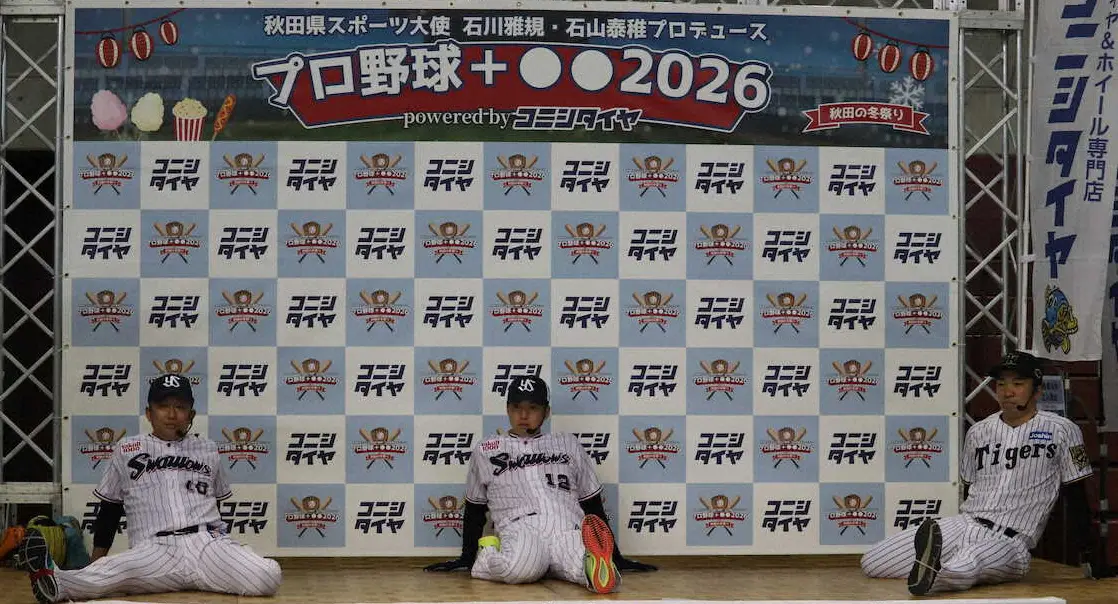 タイヤ転がしやキャッチボールなどで子供たちと交流したヤクルトの石山は「本当に力になる。小さい頃から育ったところなので、野球で元気にしてあげたい気持ちは凄く強い」と語った。