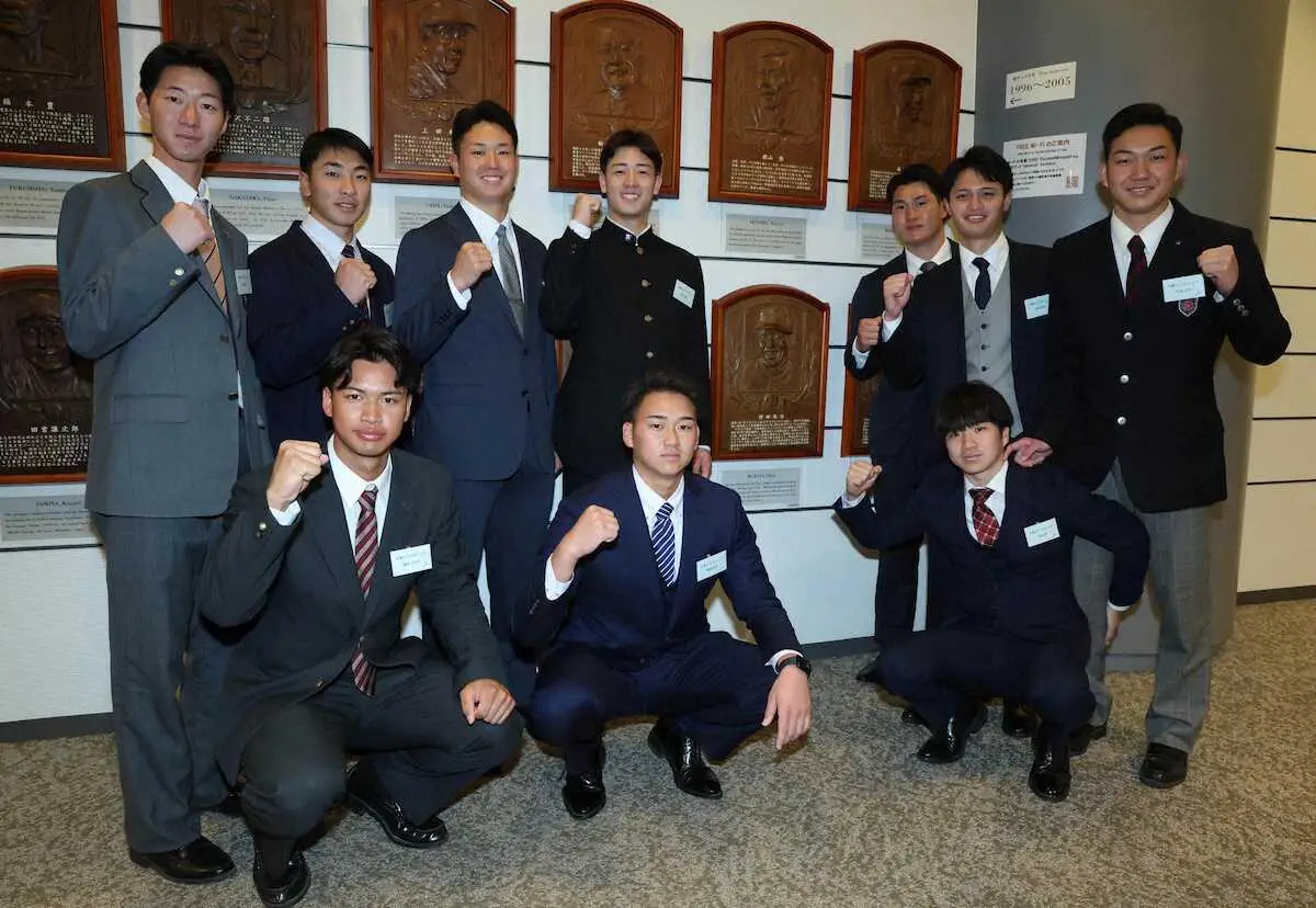 午前中は野球殿堂博物を見学。元ロッテ監督の金田正一通算400勝、シーズン31勝などの数字に驚き、球団OBのレジェンド村田兆治さんのレリーフの前で記念撮影を行った。また、25年U―18の寄せ書きに自分の名前を見つけ、23年U―18W杯優勝トロフィーや歴代の侍ジャパンのユニホームを見学。「野球報道写真展」に展示してある昨年のU―18W杯の記念写真にドラフト3位の奥村頼人投手(横浜)とサインし、一緒に写真に納まった。