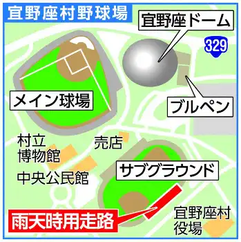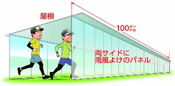 宜野座キャンプで設置される雨天用の直線走路、通称「球児ロード」は全長100メートルに及ぶ。雨が吹き込むのを防ぐよう、この長い距離を覆うように屋根を設け、壁面にパネルなどを張る。各球団はキャンプ地に室内練習場を備えているものの、走るためだけの雨よけ施設は、球界初の試みといえそうだ。