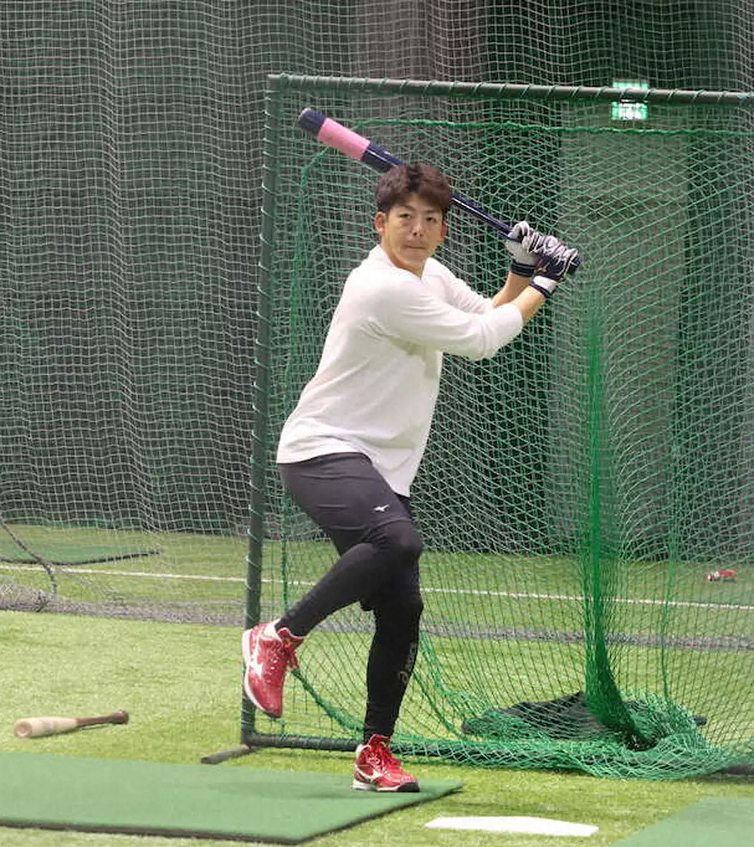 例年通りの単独自主トレ。打撃練習では、左手と下半身の使い方に重点を置く。狙いとして内野の頭上を越える打球で二塁打を量産したいという。昨年10月から技能向上をサポートする「上達屋」に通って動作解析を行う中で「長打が出ない時ほどインステップになっている」と判明。踏み込む右足がホームプレート寄りになることで「かかと体重」となり、打球に角度がつかないなどの弊害が出ていた。その悪癖改善へ踏み込む足がアウトステップとなるように意識。また、踏み込んだ際、地面からの反発を利用し、股関節を使いながらスイングすることを心がける。