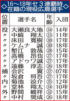 ○…16~18年の広島セ・リーグ3連覇時から現在もチームに在籍する選手は14人で、野手は野間をはじめ6人。当時の主力選手では野間が18年に126試合出場で初めて規定打席に到達し、打率.286、5本塁打、46打点、17盗塁で貢献した。菊池は3年間通じて田中広輔、丸佳浩との「タナ・キク・マル」トリオで打線をけん引。17、18年と正捕手の会沢は2年連続のベストナインに輝いた。投手では大瀬良が18年に15勝、勝率.682で2冠。守護神の中崎は16、18年に30セーブ超え。17年もセットアッパーとして、16年から2年連続で防御率1点台をマークした。